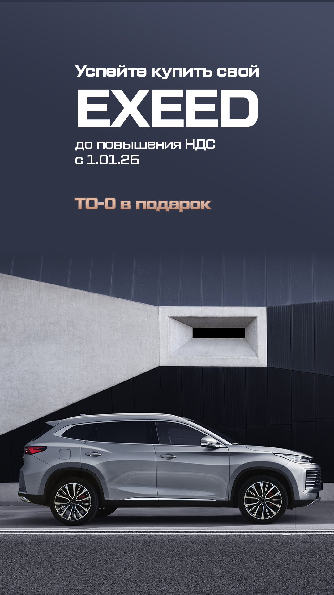 ¹ Указана цена, рассчитанная от максимальной цены перепродажи автомобилей EXEED VX FL (Эксид ВэИкс ЭфЭль) в комплектации President BL 7s (Президент Би Эль семь Эс) на 16.10.2025, без учета дополнительного оборудования или иных услуг, c учетом выгоды, получаемой при сдаче автомобиля в трейд-ин, действующей по 31.12.2025 (включительно) на автомобили 2024 г.в. Выгода по трейд-ин не суммируется с кредитными предложениями со сниженными процентными ставками при поддержке производителя. Не оферта. Представленные на изображениях автомобили могут отличаться от серийных моделей. Указанное оборудование может быть опциональным. Наличие автомобилей, цены, цвета, модели и прочие подробности уточняйте у сотрудников отдела продаж.