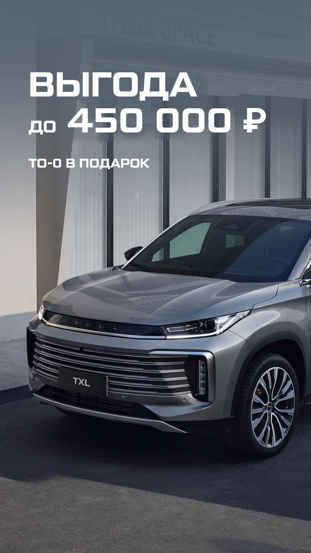 ³ Указана цена, рассчитанная от максимальной цены перепродажи автомобилей EXEED TXL (ТиЭксЭль) в комплектации Business (Бизнес) на 30.12.2025, без учета дополнительного оборудования или иных услуг, c учетом максимальной выгоды, получаемой при сдаче автомобиля в трейд-ин, действующей по 31.03.2026 (включительно) на автомобили 2024 г.в. Не оферта. Представленные на изображениях автомобили могут отличаться от серийных моделей. Указанное оборудование может быть опциональным. Наличие автомобилей, цены, цвета, модели и прочие подробности уточняйте у сотрудников отдела продаж.